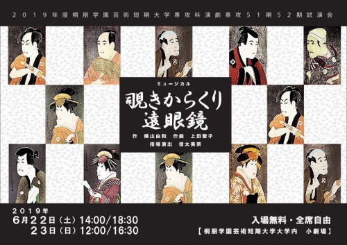 振付/『覗きからくり遠眼鏡』 2019年度第1回桐朋学園芸術短期大学専攻科演劇専攻試演会『覗きからくり遠眼鏡』上演日開演時間6月22日(土)14:0018:306月23日(日)12:0016:30上演時間は 2時間45分を予定しております(途中休憩を含む)。【入場無...