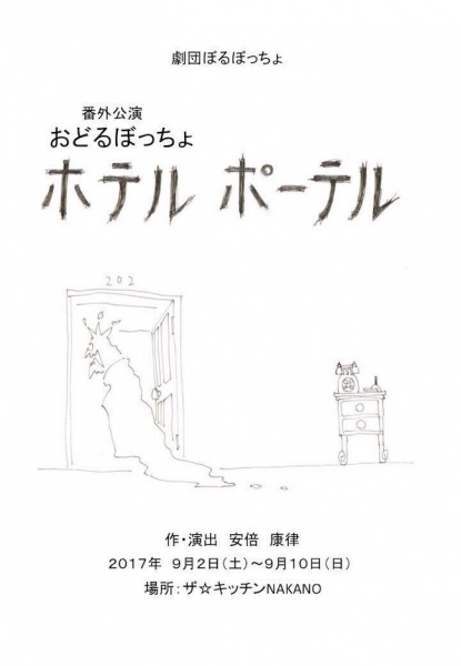 とある夏の休暇。ホテル ポーテルには沢山のお客様がご宿泊。もんくばかりの客、おくびょうな客、きれいな客、にぎやかな客、、、そして、かの有名な、スリック・ポックトック名探偵。皆、思い思いに夏の休暇を楽しんでいるなか、なにやら、とんでもない事件が起こるのです。※「おどるぼっちょ」とは、劇団ぼるぼっちょの、踊る演劇公演のことである。出演松田尚子宮河愛一郎三井聡赤澤かおり井出恵理子加賀谷一肇佐久間夕貴碓井菜央(劇団ぼるぼっちょ)公演日9月2日 土 19時3日 日 14時・19時4日 月 14時5日 火 14時・19時6日 水 19時7日 木 14時・19時8日 金 14時9日 土 14時・19時10日 日 14時会場ザ☆キッチンNAKANO(中野富士見町駅)