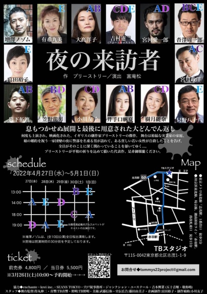 息もつかせぬ展開と最後に用意された大どんでん返し―何度も上演され、 映画化された、イギリスの 劇作家プリーストリーの傑作。 舞台は裕福な実業家 の家庭、 娘の婚約を祝う一家団欒の夜に警部を名乗 る男が訪れて、ある貧しい若い女性が自殺したこと を告げ、 全員がそのことに深く関わっていることを 暴いてゆく...。プリーストリーが平和の祈りを込めて描いた代表作、是非御堪能ください。