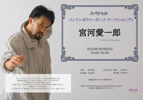 スペシャルワークショップ スペシャルワークショップ@ビートニックを開催致します。宮河愛一郎 1/19(日) 16:00~18:00 コンテンポラリーダンス ●参加費 一般 3000円 / under22 2000円 コンテンポラリーダンスと演劇的表...
